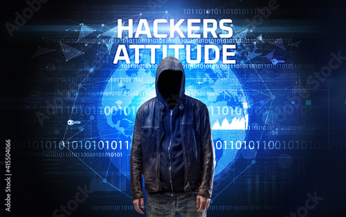 Faceless hacker at work with HACKERS ATTITUDE inscription, Computer security concept