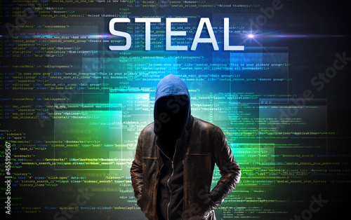 Faceless hacker on code background
