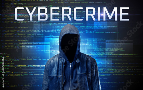 Faceless hacker on code background