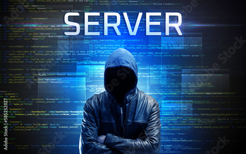 Faceless hacker on code background