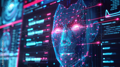Facial recognition technology, human face with lines of AI biometric system on computer screen, 3d digital scanning of person. Concept of identification, data, deepfake