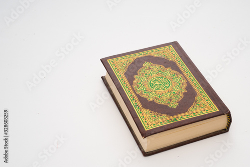 Faith in Islam concept. The Islamic holy book, Quran or Kuran, with rosary beads or “tasbih” isolated on white background.