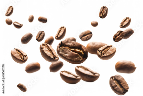 Falling roasted coffee beans isolated on white background with selective focus