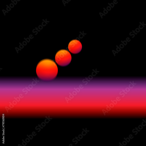 Fantasy illustration of an outer space scene. three orange gradient globes. conceptual illusion of 3D on black square background. orange and purple linear band with soft blur gradient.