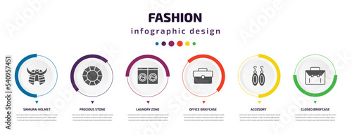 fashion infographic element with icons and 6 step or option. fashion icons such as samurai helmet, precious stone, laundry zone, office briefcase, accesory, closed briefcase vector. can be used for