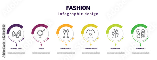 fashion infographic template with icons and 6 step or option. fashion icons such as high heel shoes, unisex, summer dress, t shirt with heart, women coat, pair sandals vector. can be used for