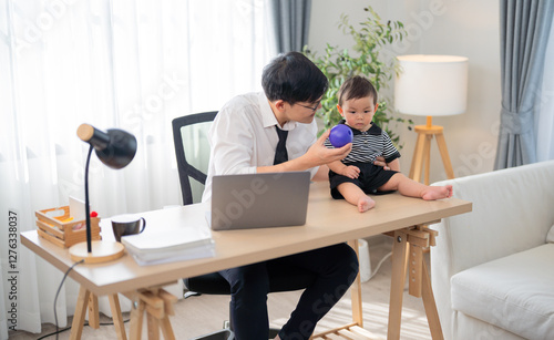 Father engages with child while working from home in a bright, cozy office setting