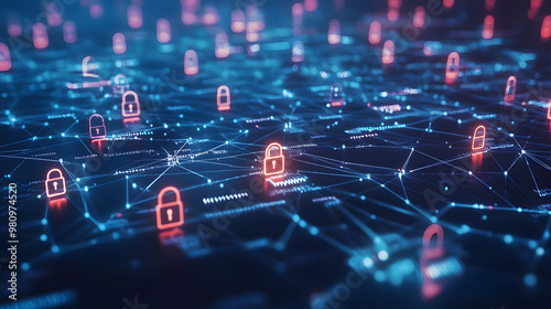 featuring a digital padlock icon, with binary code cascading around it. A digital shield and firewall symbols dominate the cybersecurity .Android robot navigating through a cyber digital world.