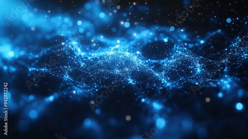 Featuring complex patterns and connections, an abstract blue digital network is displayed.