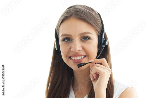 Female customer support operator with headset and smiling on transparent