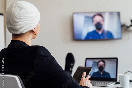 Female entrepreneur with digital tablet attending meeting through video call during COVID-19