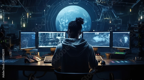 Female hacker working on multiple computer screens. Blue data. Concept of Technology professional, multitasking, data analysis, tech-savvy worker, computer screens, information processing.