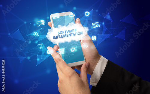 Female hand holding smartphone with SOFTWARE IMPLEMENTATION inscription, cloud technology concept