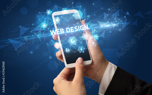 Female hand holding smartphone with WEB DESIGN inscription, modern technology concept