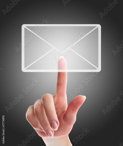 female hand pressing e-mail sign on a touch screen interface ov