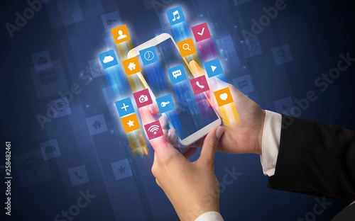 Female hand using smartphone with colorful angular fast switching application icons around