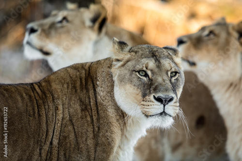 Female lion, Panthera leo, lionesse portrait, with two unfocused female lions in the background