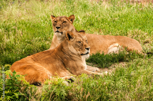Female lions lying on green grass meadow