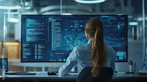 Female Programmer Working on a Large Screen Displaying Complex Data