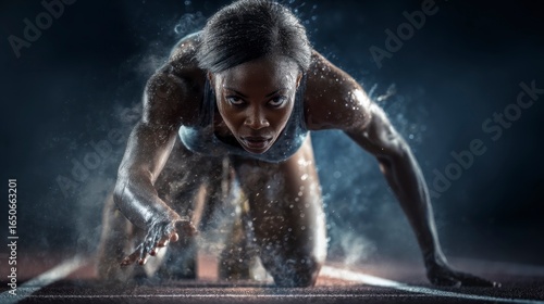 Female Sprinter Exploding from Starting Blocks in Dynamic Action Scene