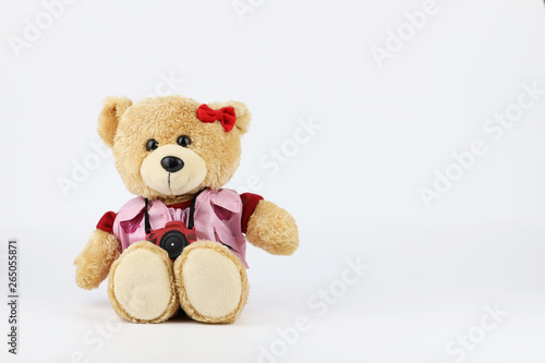 female teddy bear with camera isolated and white background