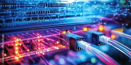 Fiber optic signals in telecommunication, showcasing light pulses, high-speed data transfer, and advanced connections.