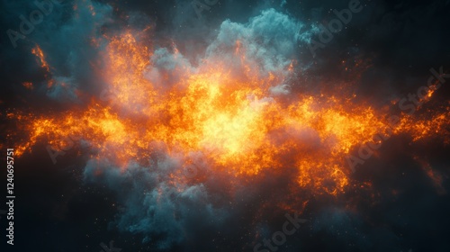 Fiery cosmic cloud explosion, dark nebula background, digital art, VFX