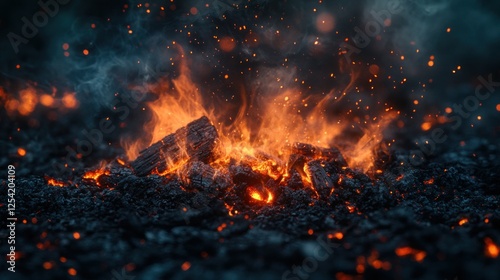 Fiery embers glowing intensely, sparks flying, dramatic background