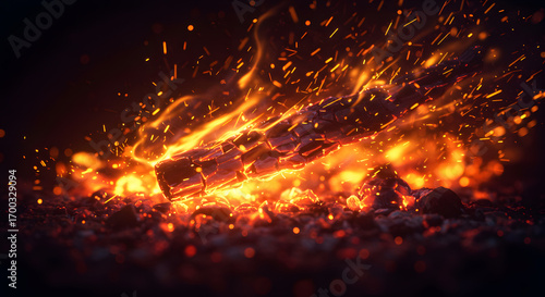 Fiery Embrace: A captivating image showcasing a vibrant close-up of a crackling campfire, with burning embers illuminating the surrounding area.
