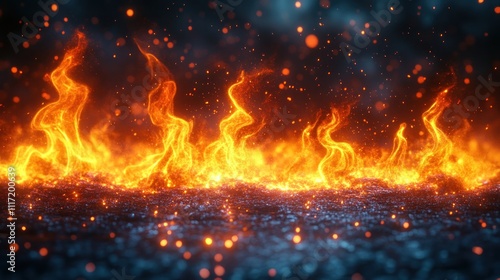 Fiery inferno flames burning intensely with glowing embers and sparks against dark background.