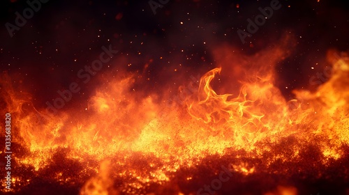 Fiery inferno raging intensely with bright orange and red flames burning fiercely against a dark night sky background.