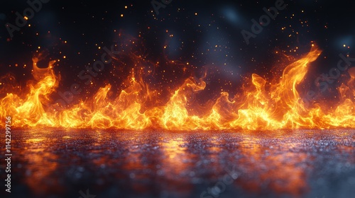 Fiery inferno reflecting on wet ground, sparks and smoke.
