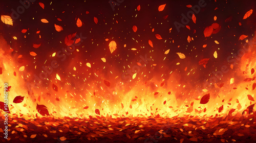 Fiery landscape with glowing embers and floating red leaves creating an abstract and warm atmosphere