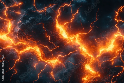 Fiery Lava Flow Illuminates Dark Cloudy Sky at Night