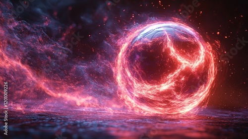 Fiery sphere, swirling energy, dark background.