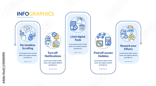 Fighting screen addiction vector infographic template. Mute notifications presentation design elements. Data visualization with 5 steps. Process timeline chart. Workflow layout with linear icons