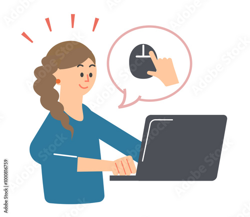 ノートパソコンを使って、マウスをクリックしている女性のイラスト