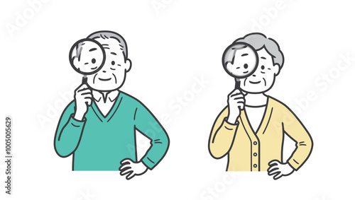 虫眼鏡を持つ後期高齢者男女の上半身イラスト