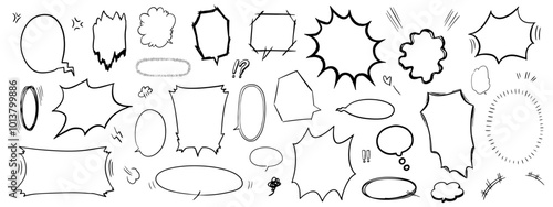 日本の漫画に描かれているような、手書きの吹き出しイラストのセット