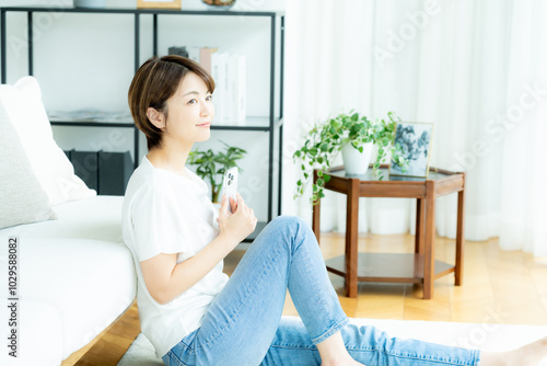 リビングでスマホを操作する女性