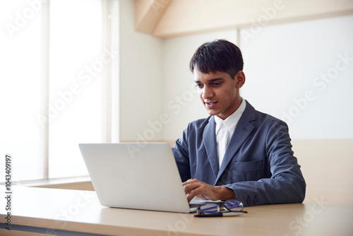 パソコンを使用して仕事をする若いインド人の技能実習生