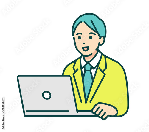パソコンで勉強する男子高校生。シンプルな男の子のベクターイラスト素材。