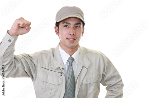ガッツポーズの作業員