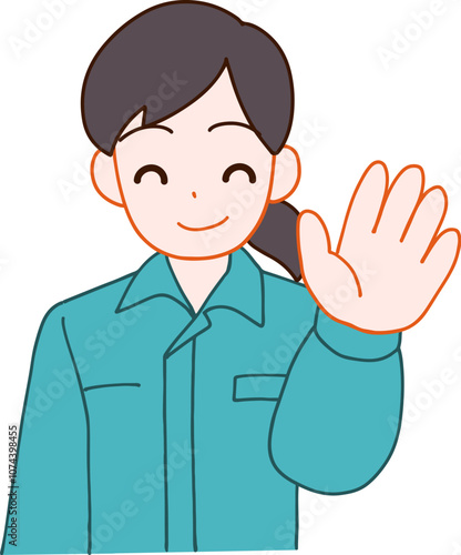 作業服を着た挨拶する笑顔のデフォルメ女性のイラスト