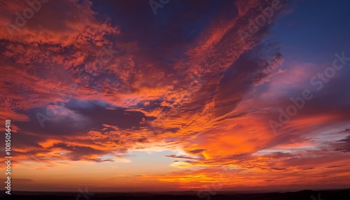 夕日の沈む瞬間、オレンジと赤のグラデーションが幻想的に空を彩る背景。