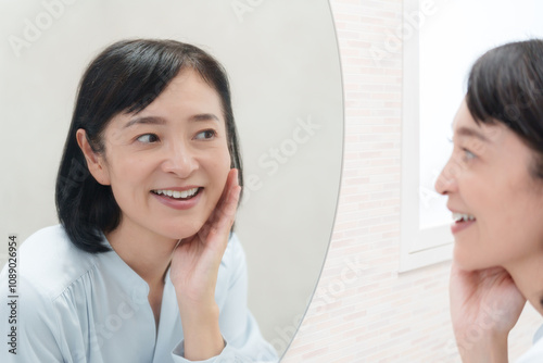 鏡を見てスキンケアするミドル女性(美容)..