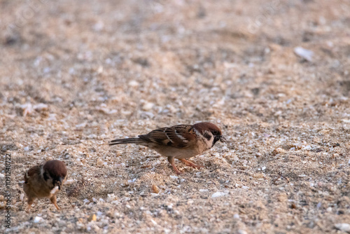 해수욕장 모래밭에서 먹이를 찾는 참새들