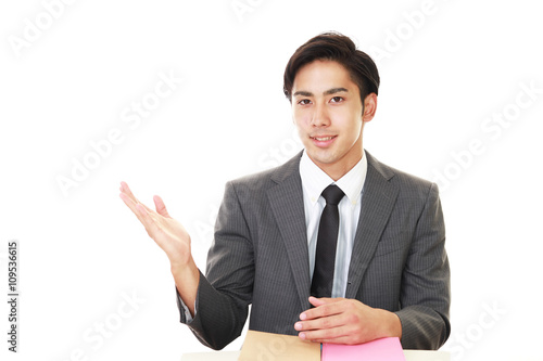 案内する笑顔のビジネスマン