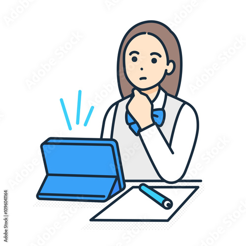 タブレットで学習する制服姿の女子高生のイラスト。考える女の子。