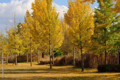 가을 단풍 은행나무 길에 노랗게 물든 은행잎이 만발하는 숲 공원의 산책길과 파란 하늘이 어우러진 배경화면